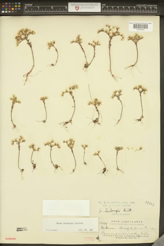 One of Leiberg and Sandberg’s campsites during their 1893 trek was south of Rock Lake, in northwestern Whitman County. Although they apparently missed it, one of the botanical denizens of the basalt cliffs in the area is Sedum leibergii (Leiberg’s stonecrop), a yellow-flowered succulent with a candelabra-like inflorescence, found in volcanic cliffs primarily in the Snake River and lower Columbia River drainage of southeastern Washington, northern Oregon, and west-central Idaho. Several other species were named for the pair, including an Astragalus, Erigeron, and Poa for Leiberg and a Lomatium, Eriogonum, and Poa for Sandberg. The specimen shown here was collected by WSU professor Rolla Kent Beattie in 1904 who, in the spirit of Leiberg and Sandberg, made baseline plant collections and observations of the flora of Rock Lake that inform studies on the changing landscape of the Columbia Plateau today. – Walter Fertig, 5 September 2025