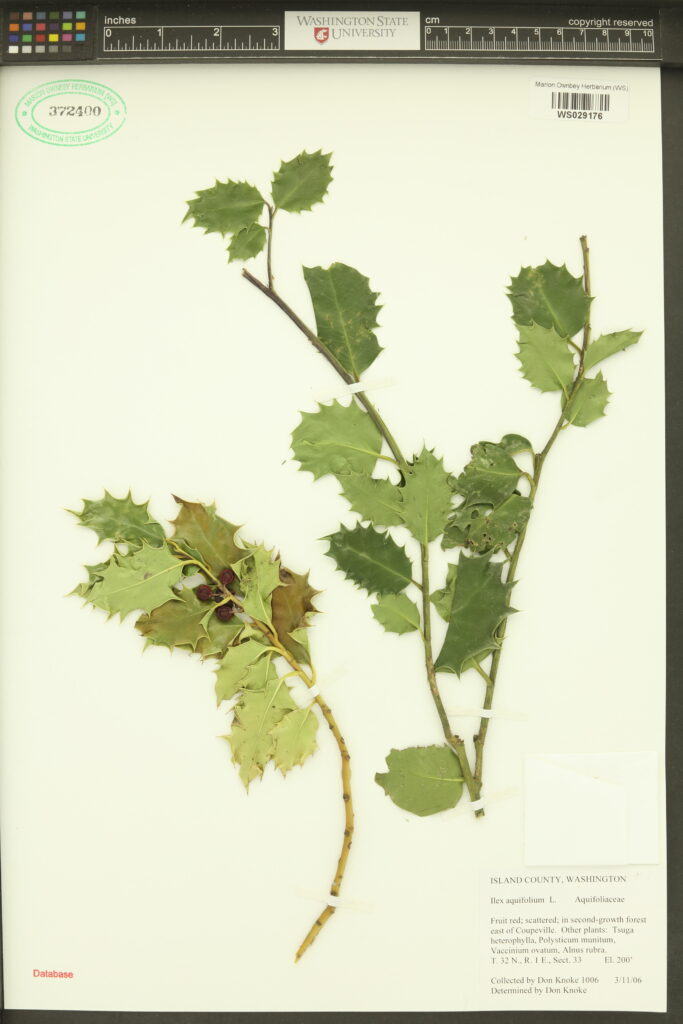 Although there is a native North American holly (I. opaca) that closely resembles its English cousin, enterprising businesspeople in Washington and Oregon brought I. aquifolium into cultivation for the holiday market. Unfortunately, English holly has escaped into the wild and become a nuisance species in the lowland forests west of the Cascades. Holly wood (not to be confused with Tinseltown, California) is exceptionally dense and easily dulls a chainsaw, making the species unpopular with silviculturists. Like animals, hollies are dioecious, producing separate staminate (pollen-producing ‘male’) and pistillate (seed-bearing ‘female’) flowers on separate individuals. One would assume that the ratio of male to female plants would be 1:1, but in fact, staminate plants are often far more common than drupe-producing pistillate trees. This anomaly results from male trees being able to invest more of their photosynthetic energy into growth and production of asexual clones (genetically identical individuals connected underground by their roots). Female trees, by contrast, spend more energy producing seeds and fruit, leaving less for growth or asexual reproduction. The added strain of motherhood also results in pistillate individuals being shorter-lived. – Walter Fertig 22 December 2025