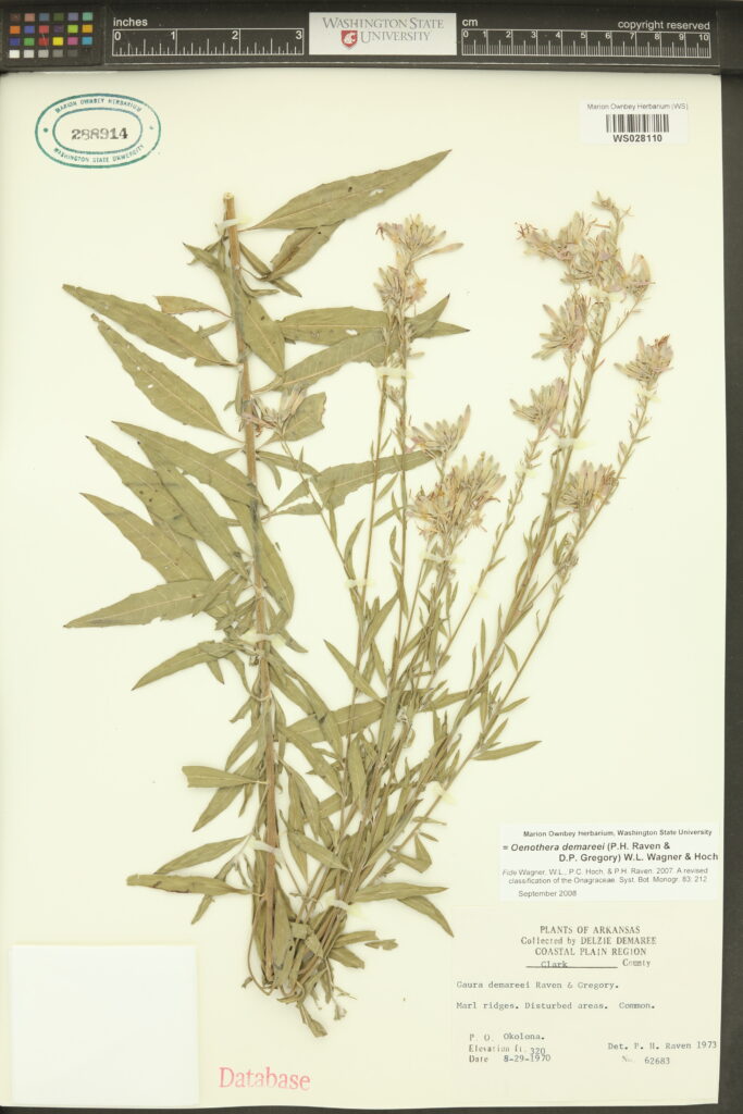 Delzie Demaree (1889-1987) was an American botanist whose name is synonymous with the flora of Arkansas and the southeastern United States. Demaree began his career as a plant physiologist, focusing on water relations in trees, but in later years became an avid specimen collector. Over his seven decade career, Demaree collected over 70,000 vascular plant specimens, including several new to science. Remarkably, Demaree did all his collecting while riding a Trailways or Greyhound bus, as he gave up driving right before leaving for Europe and the First World War in 1917 (he was a decorated US Marine). Demaree is thought to have traveled more than 200,000 miles by bus, pulling the yellow cord to exit whenever he noticed an interesting site to botanize. He would press specimens in the field (often making up to 20 duplicates) and then wait by the road for the next passing bus. As he was often dropped off far from civilization, Demaree’s labels usually recorded the nearest Post Office as a reference for his collecting sites. Demaree was still collecting specimens well into his 90s! In August 1937, Demaree got off the bus near the Arkadelphia, Arkansas, Post Office to collect a tall, white-flowered annual butterfly plant (genus Gaura in the Onagraceae or Evening-primrose family). True to their name, butterfly plants attract leipidopterans (butterflies or moths) to their slightly irregular, 4-petaled flowers. The specimen collected by Demaree was later determined to be an undescribed species endemic to southwestern Arkansas. Peter Raven and D.P. Gregory of the Missouri Botanical Garden named the plant Gaura demareei in 1973. In the late 2000s, Warren Wagner and Peter Hoch from the Smithsonian Institution reassessed genera in the Evening-primrose family using modern molecular and cladistic methods and determined that many genera, including Gaura, nested within the widespread genus Oenothera. As a result, the species was renamed Oenothera demareei in 2007. – Walter Fertig 20 January 2026