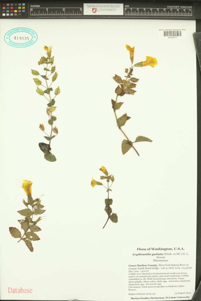 The tide of taxonomic change is overcoming inertia, however. In 2012, a group of taxonomists led by Guy L. Nesom proposed to split Mimulus, which had been determined via molecular data as paraphyletic, into numerous smaller genera. M. guttatus was transferred to the genus Erythranthe, becoming E. guttata. Many species that had been lumped into M. guttatus were also resurrected under Erythranthe, with the purpose of separating annual populations from perennials, diploids from tetraploids, and so on. Most major floras have adopted the newer circumscriptions. Despite this wider acceptance, many new academic articles persist in using the older, unsplit Mimulus names. The tension reflects a fundamental, not easily addressed, question of taxonomy: how best to know the things we know? – Henry Landis, 20 February 2026
